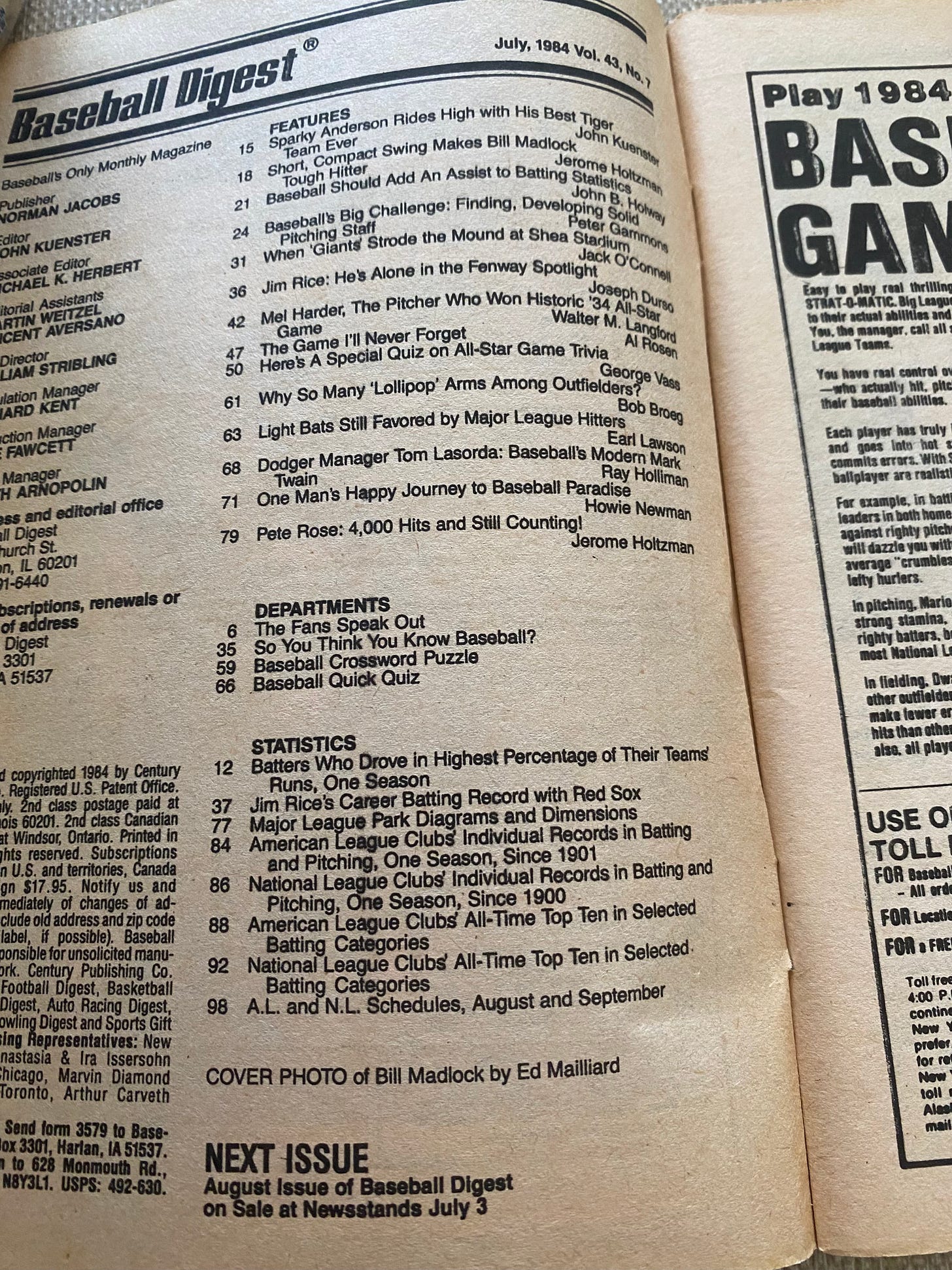 As a periodic reminder an issue of Baseball Digest with a cover date of July would have hit the newsstands in early June, so all of the content would have been written by early to mid May. Much of what happened in the 1984 season would not have been obvious by this early date, but there is one that was. It was in 1984 that the Tigers started off the season on a 35-5 run on their way to a World Series title. By this point in the season it was already clear that this had the makings of a special year. Sparky Anderson had a notable quote in this issue’s lead article on the Tigers. He hoped that he could manage until he turned 75 and that he could surpass 3,000 career managerial wins. It may have been the enthusiasm of a promising start talking, because as great of a manager as he was he fell well short of both goals. 3,000 wins would have placed him second on the all-time list behind only Connie Mack. As it was, he finished with 2,194 wins, ranking him 7th on the current list. And he was 61 years old in his final year at the helm.