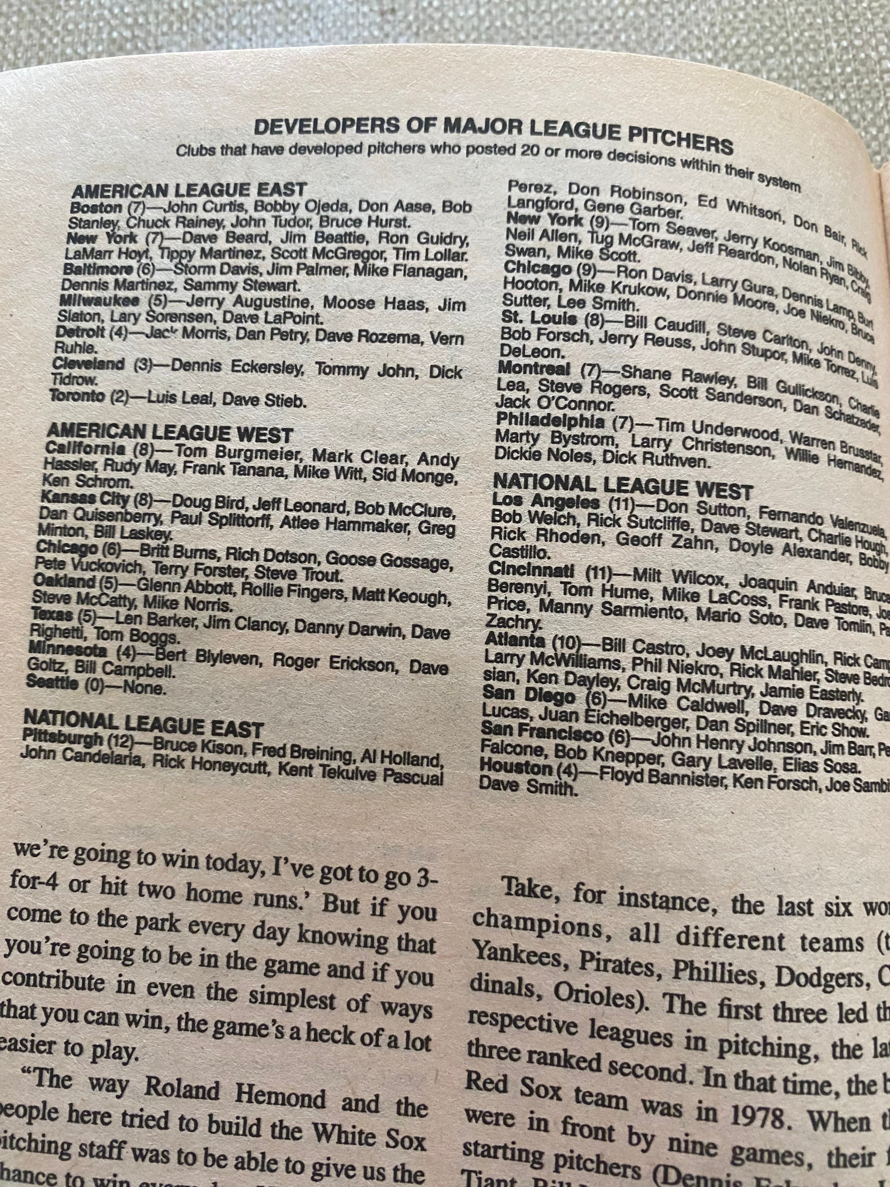 Speaking of pitching, Peter Gammons penned a piece discussing the difficulty of developing young pitchers. It was accompanied by a chart listing how many pitchers each franchise had produced who totaled at least 20 decisions with their clubs. This makes for a great exercise in Remembering Some Guys, or of finding some great answers for Immaculate Grid.